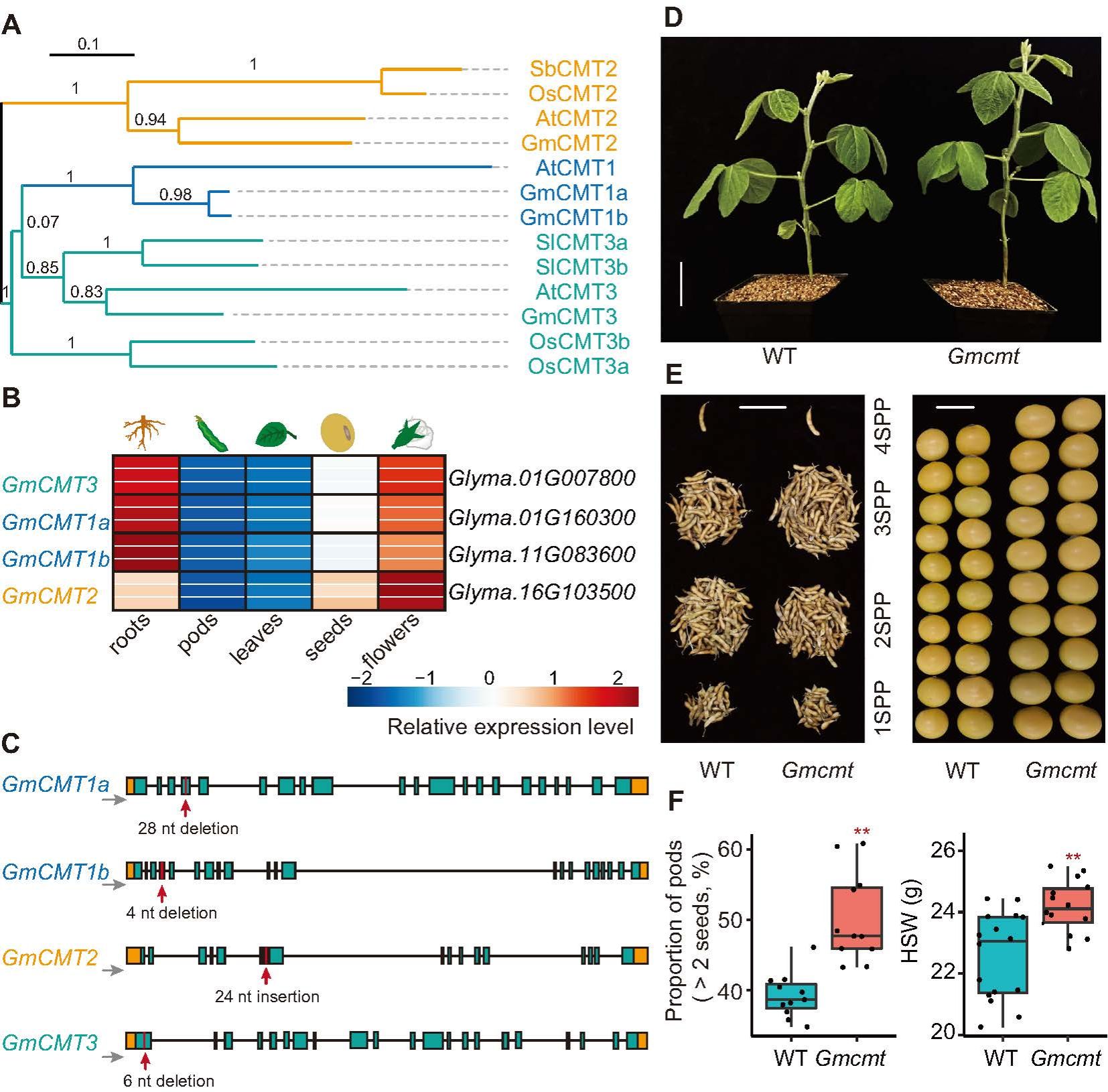 该研究通过应用 CRISPR/Cas9 基因编辑技术,创建一个缺失大豆中所有CMT基因功能的大豆(Glycine max)突变体系Gmcmt,这一突变体系在non-CG (CHG和CHH) DNA甲基化位点表现出明显的低甲基化,从而增强了染色质的可访问性,并显著调节了包括GOLDEN-LIKE10 (GmGLK10)在内的数百个功能相关基因的表达。这些基因的表达变化不仅提高了光合作用,而且意外地提升了根瘤菌的固定效率。此外,Gmcmt还产生了体积更大、蛋白质含量更高的种子(图2)。这些分子层面的变化最终促进了大豆种子产量和质量的双重提升,体现了non-CG DNA甲基化在提高作物整体产量中的核心功能,展示了表观遗传修饰在农业生产中提升大豆性状的潜力。