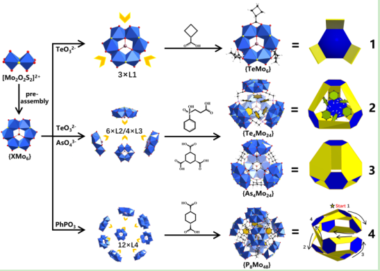 高维分子组装体形成的基础在于[Mo2O2S2]2+构建单元在宽pH范围内保持稳定。选择合适的阴离子模板和柔性的非平面有机配体协同诱导[Mo2O2S2]2+从单体{TeMo6}扩展到四面体笼状结构{Te4Mo24}和{As4Mo24},再到四重扭曲的Möbius纳米带{P8Mo48}。配体的立体特异性和阴离子模板不同的空间位阻是形成这些特定结构的关键。
