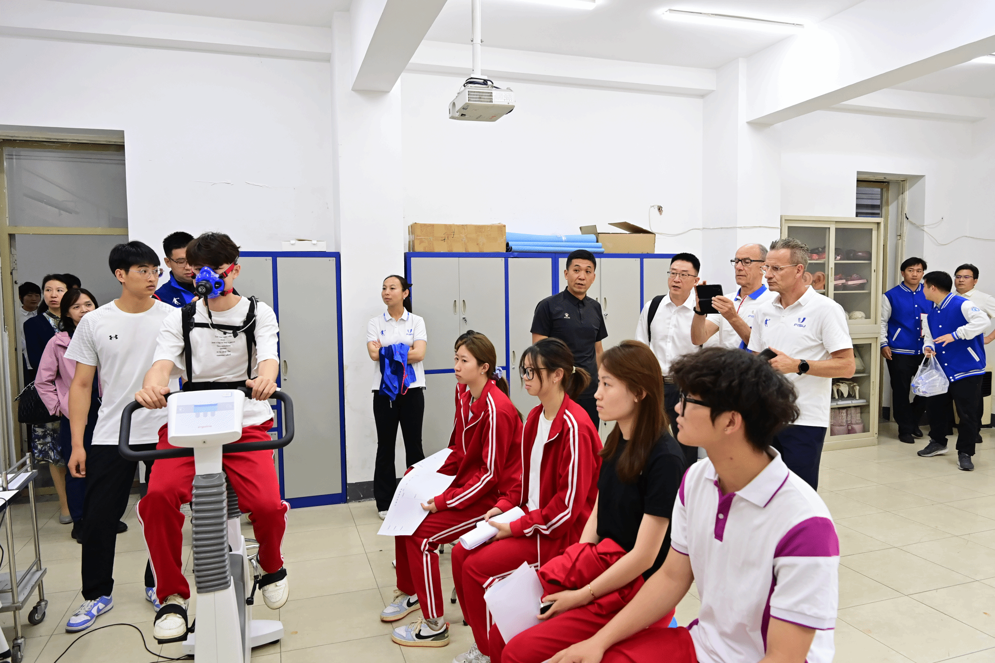 在基础体能评估与诊断实验室、等速肌力实验室,雷诺·艾德一行走上测试仪器,亲自体验了核心力量项目测试,并认真听取了测试报告解读,对我校“把实验室搬到运动场,请运动员走进实验室”的科教融合做法作出高度评价。