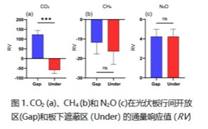近日,基于在我国东北松嫩草地开展的野外原位研究,生命科学学院邢福教授团队发现,光伏阵列的行间开放区域(Gap)是CO2的“源”,而光伏板下的遮蔽区域(Under)则是CO2的“汇”;同时,行间区域和遮蔽区域均是CH4的“汇”和N2O的“源”(图1)。与光伏阵列外的周边草地(Ambient)相比,光伏阵列内的持续通量全球变暖潜势(SGWP)增加8.14 %(图2)。结构方程模型(SEM)分析表明,光伏阵列对依托的草地温室气体通量的影响主要是由土壤温度和水分的变化引起的。...